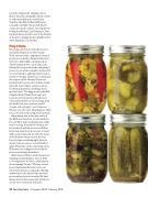 lids and jars, prep fresh foods, and gauge if preserves are acidic enough to be jarred (if not, you’ll need to add ingredients such as lemon or vinegar). Polmateer recommends the recipes on the National Center for Home Food Preservation’s website (nchfp. uga.edu). Leiss’s blog is a great resource, too (farm2chefstable.com/blog). If you prefer a book, “The biggest one is the Ball Complete Book of Home Preserving,” says Leiss. As for how preserved foods taste, “there will always be a flavor change from the fresh food, since you have to add vinegar, salt and sugar,” says Polmateer. But, she says, the same thing happens when you cook fresh foods using other methods.