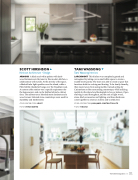 ARMONK A black-and-white palette with dark- wood laminate sets the tone for this modern kitchen, a collaboration with Leicht. As the jewelry of the space, a Shakuff tube light sparkles over the island, while a Pelle bubble chandelier hangs over the breakfast nook. A custom coffee station was a special requirement for the homeowners and can be hidden behind a cabinet door. The cabinets are a blended matte laminate and a wood veneer. Sintered stone countertops were used for durability and timelessness.