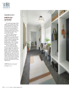 The tops of the coat closet doors are customized with per- forated antique-brass metal inset panels that allow coat fabrics to breathe, while adding a bespoke design element. A combination of adjustable hooks and wood with brass pulls punctuates doors and cubbies. The bench seat with dec- orative pillows allows for putting on shoes comfortably, making this space the perfect mix of style and function.