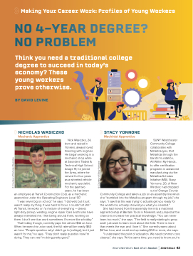 She had moved from the assembly line into a machinist apprenticeship at Bantam Tools in Peekskill, and jumped at the chance to increase her practical knowledge. “You can never learn too much,” she says. “The field is really starting to grow, and I just want to learn more about the field. There is more than meets the eye, and I love it.” She currently earns about $21 an hour, and could end up making $50 or more, she says.