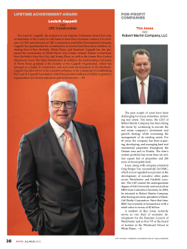 For Louis R. Cappelli, the recipient of our Lifetime Achiement Award this year, revitalization of the county he calls home is more than a business venture; it is a mis- sion. As CEO and chairman of LRC Construction and Fuller Development Company, Cappelli has spearheaded the revitalization of several local downtown districts, in- cluding that of New Rochelle, White Plains, and Stamford. Cappelli has also pio- neered the construction of White Plains’ City Center, Atlantic Station in Stamford, New Rochelle’s New Roc City and Trump Plaza, as well as the former Ritz-Carlton Westchester (now The Opus Westchester). In addition, the hardworking University of Notre Dame graduate is the founder of the Cappelli Organization, which has emerged as a leader in construction and real estate development in the Northeast. Cappelli has also striven to be a positive influence in his community by establishing the Louis R. Cappelli Foundation, which has provided millions of dollars in grants to organizations involved in education and social services. —PA