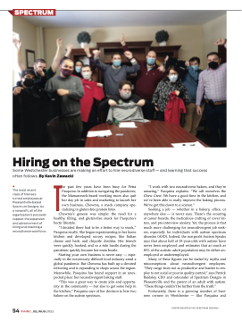 Seeking a job — whether in a bakery, office, or anywhere else — is never easy. There’s the scouring of career boards, the meticulous crafting of cover let- ters, and pre-interview anxiety. Yet, the process is that much more challenging for neurodivergent job seek- ers, especially for individuals with autism spectrum disorder (ASD). Indeed, the nonprofit Autism Speaks says that about half of 25-year-olds with autism have never been employed and estimates that as much as 85% of the autistic adult population may be either un- employed or underemployed.
