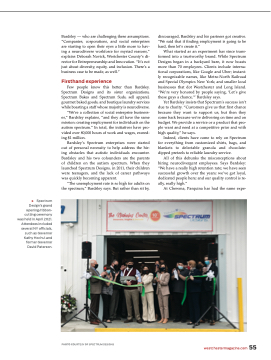 “We’re a collection of social enterprise business- es,” Bardsley explains, “and they all have the same mission: creating employment for individuals on the autism spectrum.” In total, the initiatives have pro- vided over 80,000 hours of work and wages, exceed- ing $1 million.