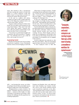 “[Employers] have a variety of reasons,” she explains. “Sometimes, they have a personal con- nection — someone in their family, or in their community, is neurodiverse and brings to their attention the challenges that this population has in finding employment.”