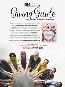 914INC. in partnership with NonProfit Westchester, presents its annual Giving Guide: Regional Philanthropic Opportunities. This supplement, featuring the area’s nonprofit organizations, will be included in the Nov./Dec. issue of 914INC. It will also be distributed by Nonprofit Westchester and at events throughout the year. The Giving Guide provides nonprofits with a unique opportunity to have year- long exposure to the region’s most influential leaders who are looking to support our most important community resources.