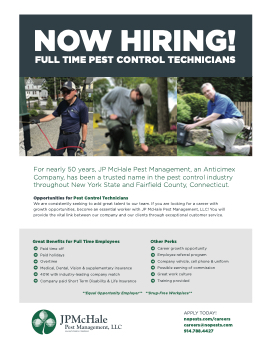 We are consistently seeking to add great talent to our team. If you are looking for a career with growth opportunities, become an essential worker with JP McHale Pest Management, LLC! You will provide the vital link between our company and our clients through exceptional customer service.