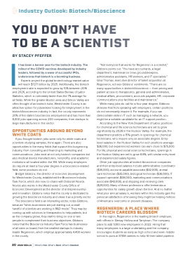 If you thought biotech jobs were only for white coats and scientists studying samples, think again. There are also opportunities in the many fields that support this burgeoning industry, from consulting and financing to marketing and communications. Jobs exist at not only biotech companies but also medical device manufacturers, nonprofits, and academic institutions all located within the 914. While many employers do require at least a four-year degree in a bioscience-related field, some positions do not.