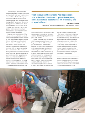 on learning and training. Entry-level candidates take online classes through a system called Regeneron U to learn different facets of the company, plus the LinkedIn Learning website helps employees brush up on skills such as Excel if needed. The most important quality that Thomas looks for in candidates is agility. “Our workplace