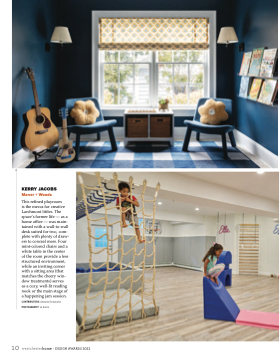 is the mecca for creative Larchmont littles. The space’s former life — as a home office — was main- tained with a wall-to-wall desk suited for two, com- plete with plenty of draw- ers to conceal mess. Four mint-colored chairs and a white table in the center of the room provide a less structured environment, while an inviting corner with a sitting area (that matches the cheery win- dow treatments) serves