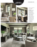 and an underuti- lized bedroom, the designer created a more functional space for this home office. Open bookshelves create visual har- mony between the different functions of the space: office, bar, and lounge. Texture, warm wood, family- friendly fabrics, and
